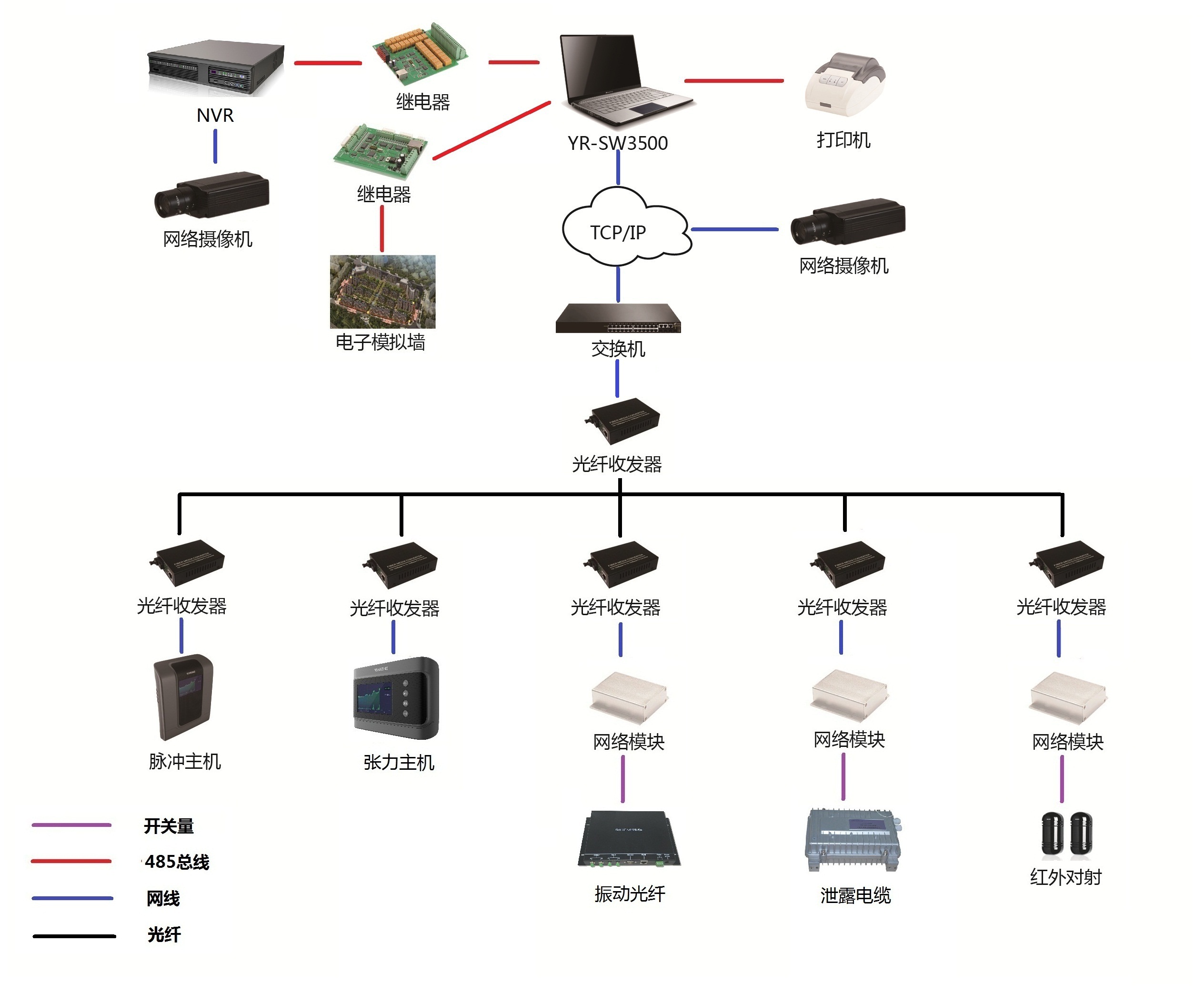 周界每0.6~1公里放置一臺(tái)中心控制鍵盤,這0.6~1公里區(qū)域內(nèi)的前端設(shè)備(脈沖圍欄主機(jī)/張力圍欄主機(jī)/泄露電纜主機(jī)/振動(dòng)光纖主機(jī)),通過RS485總線的方式接入到中心控制鍵盤,中心控制鍵盤通過光纖收發(fā)器接入交換機(jī),并使用網(wǎng)絡(luò)單機(jī)控制軟件SW3500進(jìn)行集中管理。